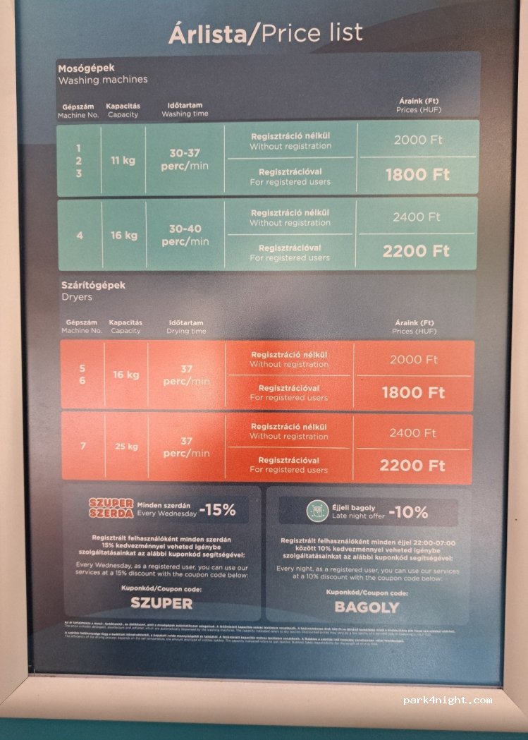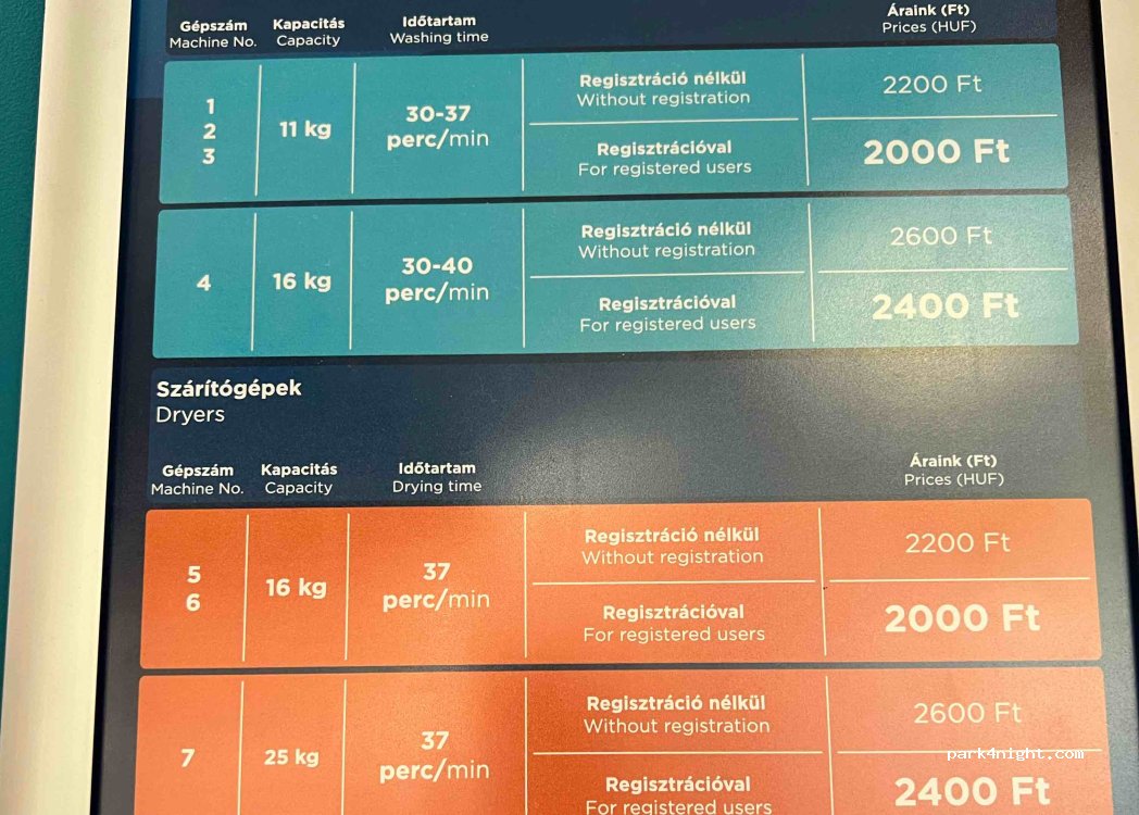 Świetna pralnia! Pranie wyprane w 31min, a wysuszone w 37min. Koszt prania 16kg = 2600 HUF, koszt suszenia 16kg = 2200 HUF. Na miejscu można wypić kawę z automatu lub poczytać gazetę na wygodnej sofie. Polecam!