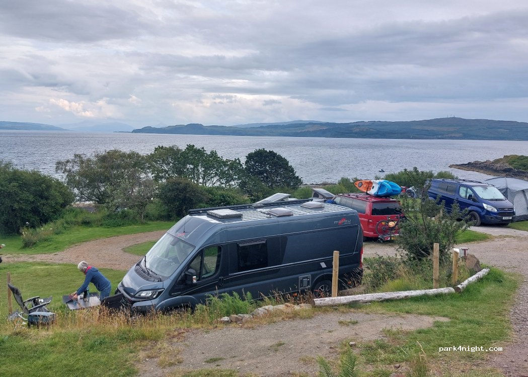 Great location with pitches on various terraces offering great views towards Mull. Steep drive but good surface so no problem getting in and out. Didn't use the toilet/wash facilities but the site would benefit from a drive over grey waste disposal. Very friendly and relaxed place.