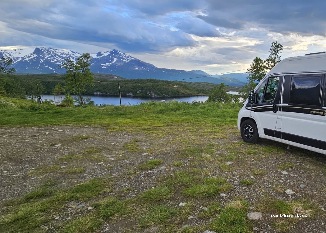 Due to a tunnel closure, we were redirected over the Korgfjellet mountain pass (525 m high) and have found the rest stop / parking this great pitch with magnificent views of nature. Fit for multiple campers. No service facilities.
