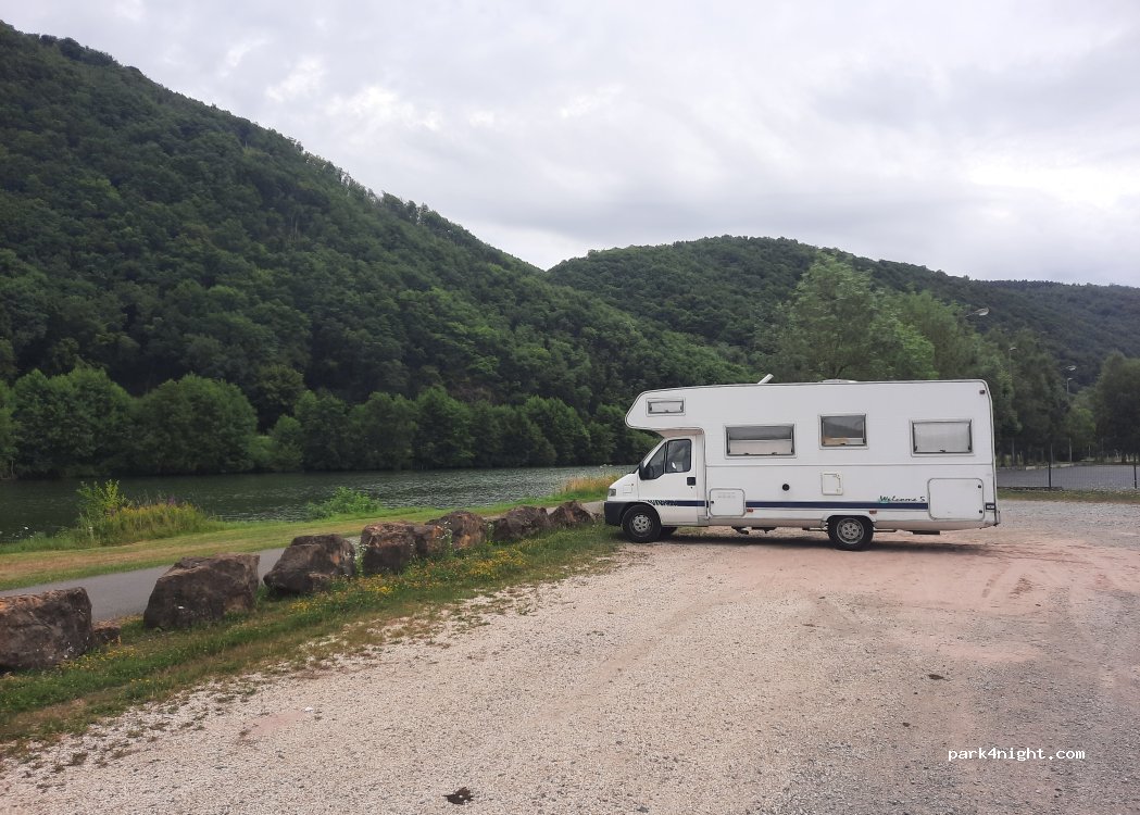 Mix parking tussen voie verte en sportveld aan doodlopende weg, beetje oppassen als het regent dat je niet in een plas staat. Fietsen naar Charleville (Z) 46 km heen en terug, naar Monthermé (N) 20 km heen en terug. Aldi op 1,6 km en Lidl op 1,4 km. Van 20.00-23.00 uur verlicht een scherpe ledlamp de plek. Mooi uitzicht op de Maas en beboste berg, de trein aan de overkant van de Maas stoort niet.