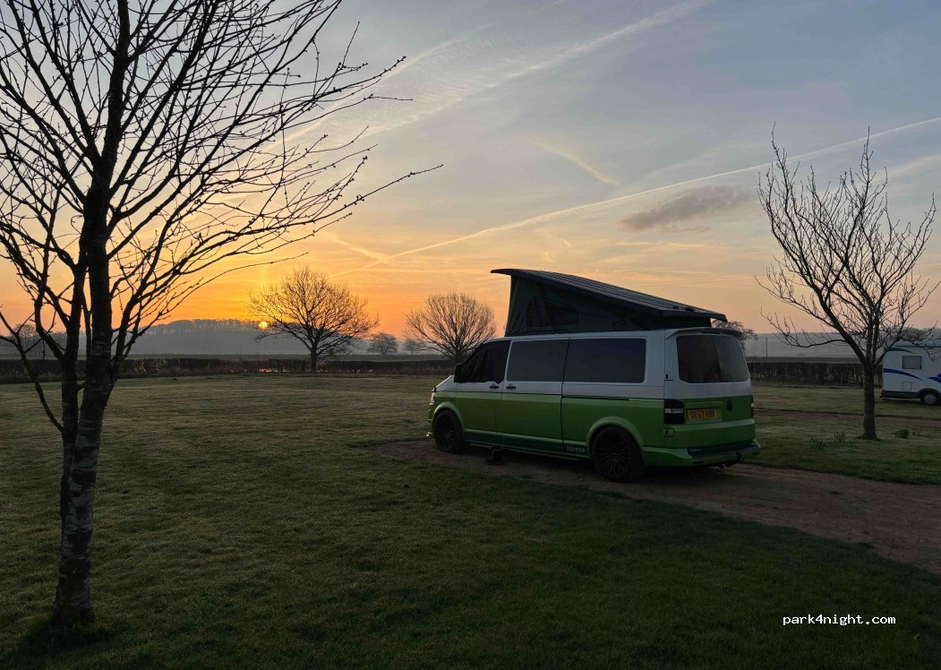 Brenk House Farm campsite. Flat, grass for parking/camping. Small, laid back campsite. Beautiful location. Full details on their website.