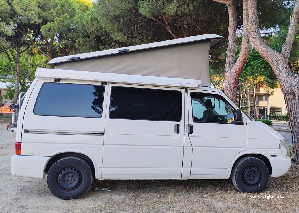 We stayed on night on the way to Bari. It was shady under the trees. A short walk to the beach. It was very crowded on a Sunday morning. There was a fun fair nearby, no noise or problems for us, we didn’t arrive until after dark. On Sunday morning there was a street market close by.