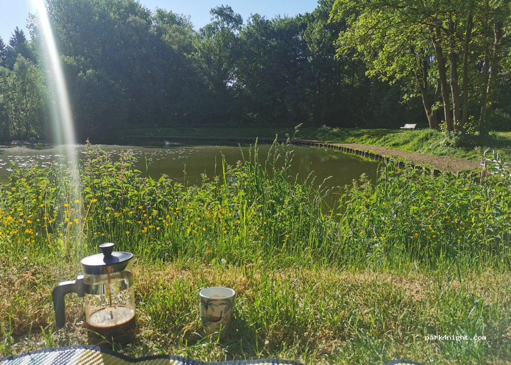 Fantastische plek op een parkeerplaats bij een visvijver. Heerlijke plekken rond de vijver, in het gras en tussen het gekwaak van de kikkers.