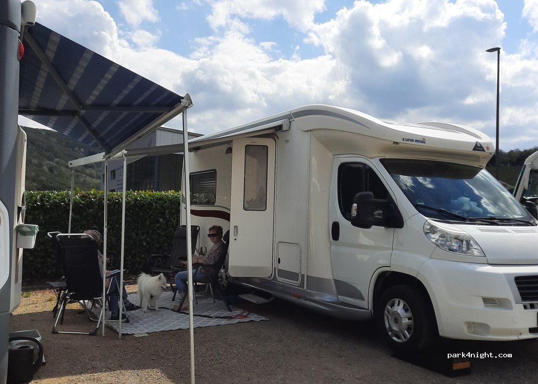 Platz im Industriegebiet, Bäcker um die Ecke, Anmeldung im Weinverkauf. Sollte der geschlossen sein kommt täglich um 17:00Uhr jemand zum kassieren. 10€ pro Tag plus 2€ für Strom sind ok. Restaurants in der Nähe, Edeka um die Ecke. Für ein oder 2 Nächte ok.