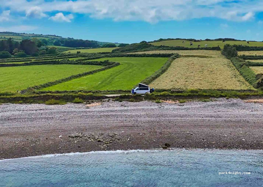 Truly beautiful - quiet, calm, sheltered (arrived in a brief storm) & a gorgeous morning spot with waves lapping. The stones on the beach are smooth tumbled granite of all colours - lovely. Definitely only space for a couple of vans & a slightly tight turnaround, but a top spot for such lucky people!