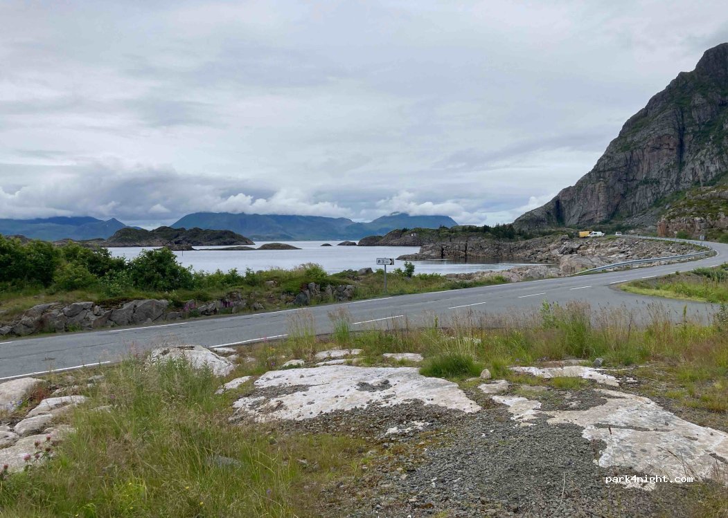 Wir haben auf dem rechten Parkplatz eine wunderbare ruhige Nacht verbracht. Bei gutem Wetter ist der Ausblick auf die Lofotenkette gigantisch. Sowohl ein Spaziergang (an der Straße) ins Dorf als auch die Wanderung zum Festvagtind sind von hier zu machen. Absolute Empfehlung.