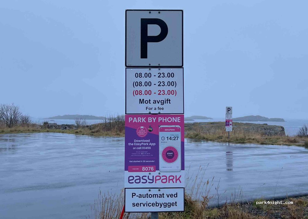 Update vom July 2023: Auf der linken Seite darf man von 8:00 - 23:00 kostenfrei für max 2 Stunden stehen. Danach ist Parkverbot. Auf der rechten Seite kostet es 24 NOK je Stunde, was wir für völlig überteuert gehalten haben und sind deshalb weitergefahren. Bezahlung über App.
