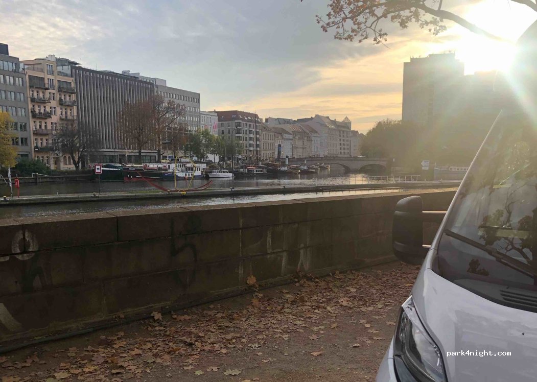 Excellent place to park for a day in Berlin. Quiet street but walking distance to Alexander Platz with shopping malls and restaurants. Beautiful street along the river. We didn’t spend the night but saw other motorhomes that did. Free after 22.00.