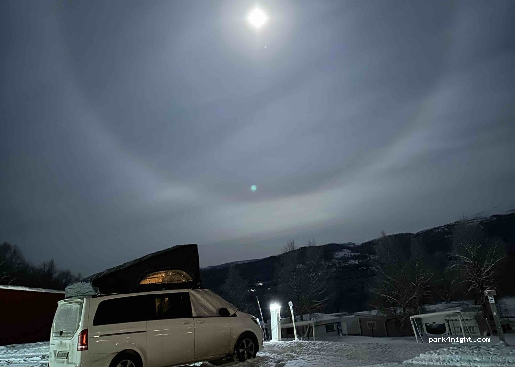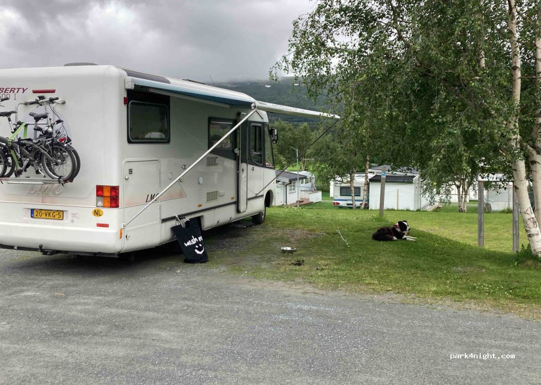 NOK 260 without electricity, with wifi. Camper alotments are close together on gravel. Mostly year-round guests. A6 very near, but no problem with the noise inside the van. Simple sanitary, old but very clean, temperature inside 28°C! Shower NOK 10 with thermostatic tap, Washing machine a decent Miele for NOK 20, drying room available. Only black water, NO grey water dump, or use a bucket.