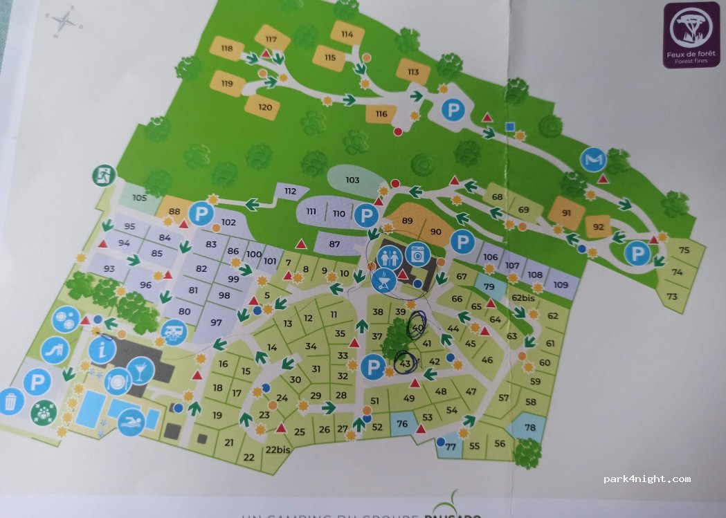 Very nice campsite set in trees. Access for large campers/long caravans would be limited. Pitches all pretty flat with a reasonable degree of privacy. Site staff very helpful. Very nice swimming pool area. Toilets clean and functional. Good base for visiting Lavender fields and old villages.