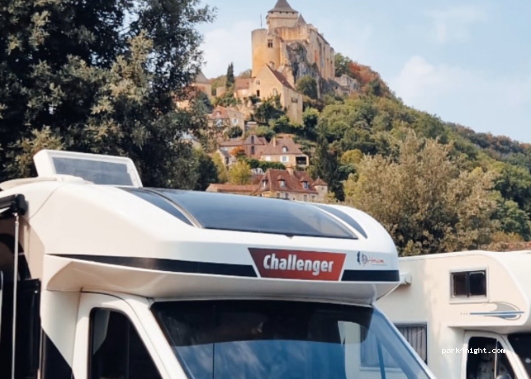 Aire de parking aménagée avec limite de temps (dépassée sans problème), bien éclairée, au pied du château de Castelnaud, avec WC, boulangerie, brasserie, restaurant, table de pique-nique, canoë et plage. Peu de voisins la nuit mais le parking se remplit très vite le matin (visiteurs du château et baigneurs). Attention, on est tout de même à portée de tirs des catapultes du château