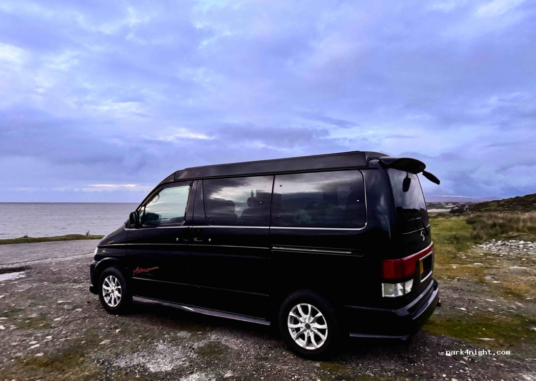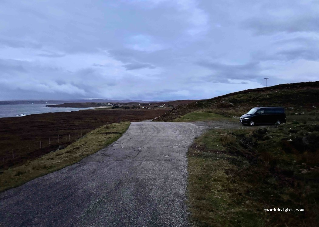 Brilliant stay here only one other vehicle passed all night was a farmer and got a friendly wave , Sat with the door open with a nice beverage over looking the sea, would get a good 30 mins at a time before midges came but hey if you complain about midges don’t come to Scotland!