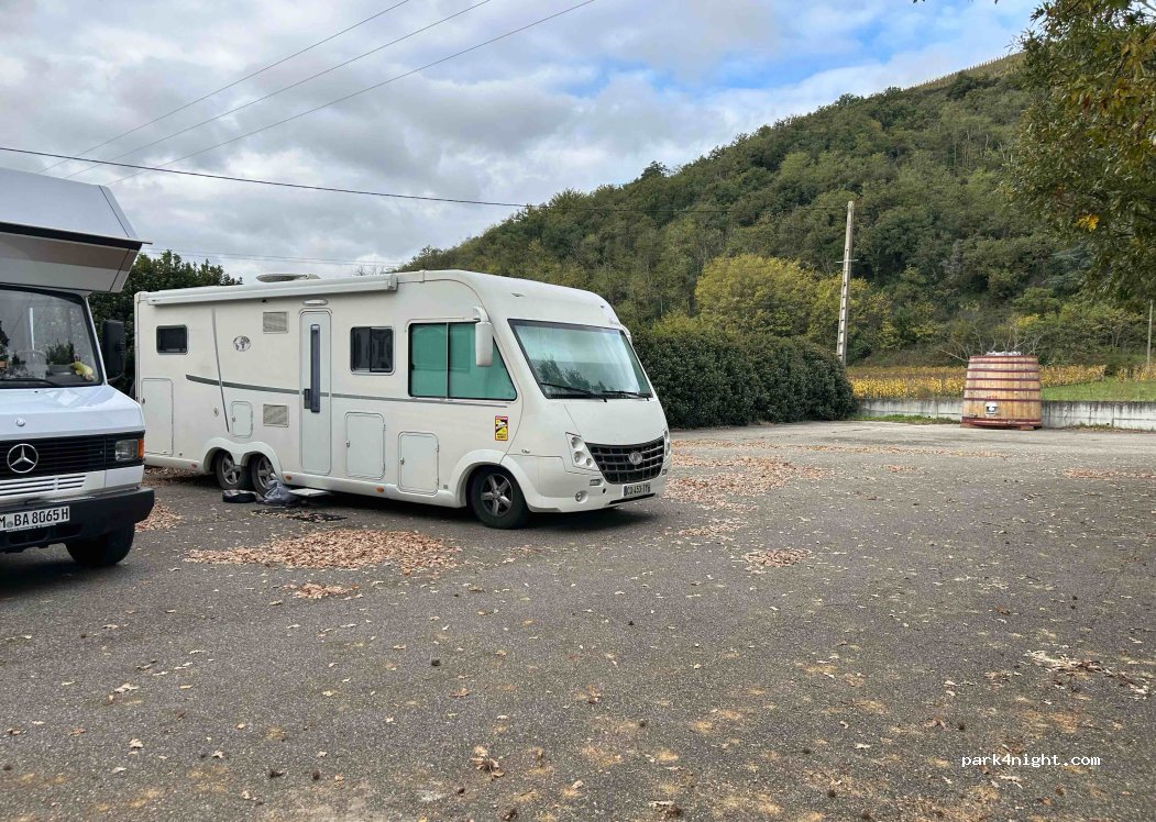 Stationnement gratuit , grand sur sol goudronné, le personnel du caveau et très sympa si vous achetez du vin vous avez droit à un jeton pour 1 heure d’électricité et 100 L d’eau . Nous reviendrons