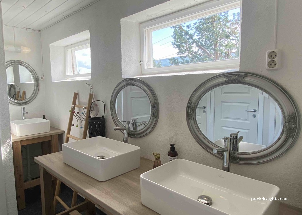 deze camping vonden we echt geweldig: mooi gelegen, charmant en een geweldige gastvrouw die duidelijk begaan is met de gezelligheid van haar camping: vaasjes met bloemen, kaarsjes en lampjes, heel wat gezellige zithoekjes die je kan gebruiken, zicht op mooie vijver en haar moeder breidt typisch Noorse sokken, mutsen... ideaal als souvenir!