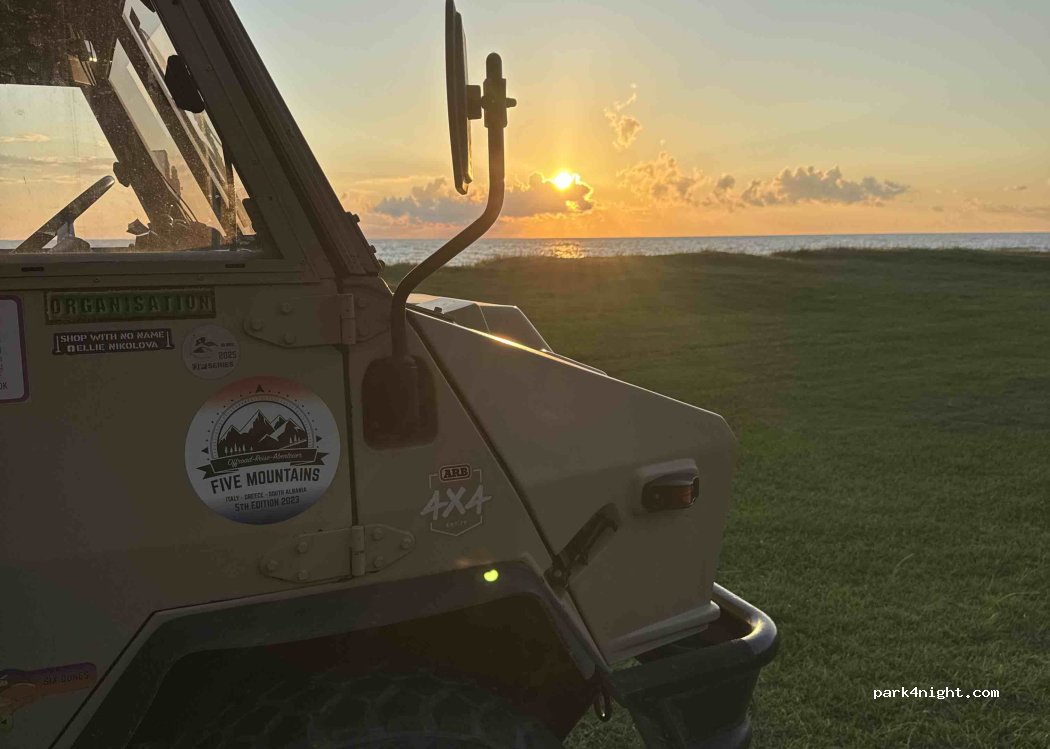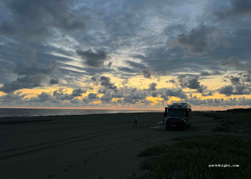 Wildes Parken, es gibt einen Schatten, Zugang zum Meer, kostenlos. Wir hielten für die Nacht an unserem Wohnmobil an. Ständig läuft die Polizei. Lokale haben eine Pause am Nachmittag, Grillen. 70 meter zum wasser