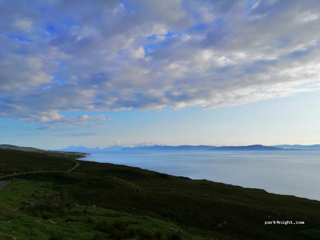 Small car park with a fantastic view of Skye and beyond. One other motorhome there when we arrived (~18h). Peaceful night with beautiful views to wake up to.
