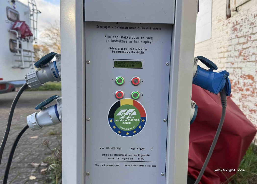 Rustige plek. Voor 1 euro 4 uur stroom. Water ook een euro. Afstort grijs en volgens het bord aan de muur, ook zwartwater in dezelfde afvoerput. Met spoelslang om tank schoon te spoelen. Goede uitvalbasis om te fietsen Achterzijde plaats ziet er wat rommelig uit. Terras met Wifi ernaast. Neem een drankje en vraag om de Wifi code.