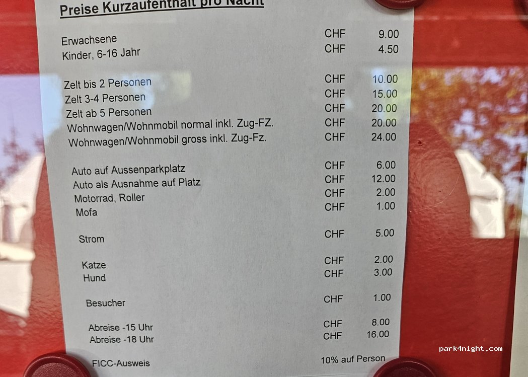 Wir waren spontan vom 4.1.24 bis 5.1.24 hier. Kurz vorher angerufen und uns wurde mitgeteilt, dass man ein Plätzchen für uns finden wird. Angekommen und super super nett empfangen worden. Haben einen super Stellplatz erhalten. WLAN ist im Preis von 38CHF enthalten. Duschen und WC nicht ganz neu aber warm und richtig sauber. Essen, Bus und Einkaufen in nur 2 Minuten Fußweg.