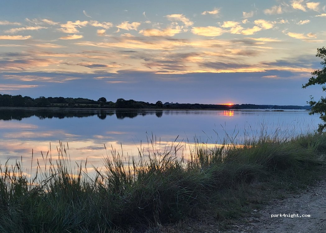 Sehr ruhiger und geräumiger Parkplatz hinter einer Turnhalle. Nur wenige Minuten zum kleinen Ortskern mit Bäcker und ein paar Restaurants. Bushaltestelle ist ebenfalls nur wenige Minuten zu Fuß entfernt. Mit der Linie 7 für 1,50€ kann man in 15 Minuten Vannes erreichen. Sie Straße hoch sind auch ein paar Picknick Bänke vorhanden.