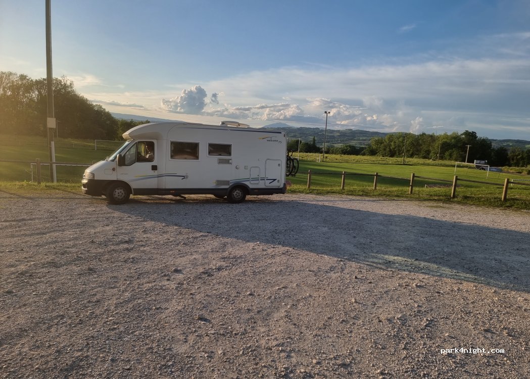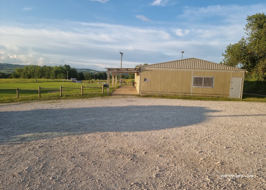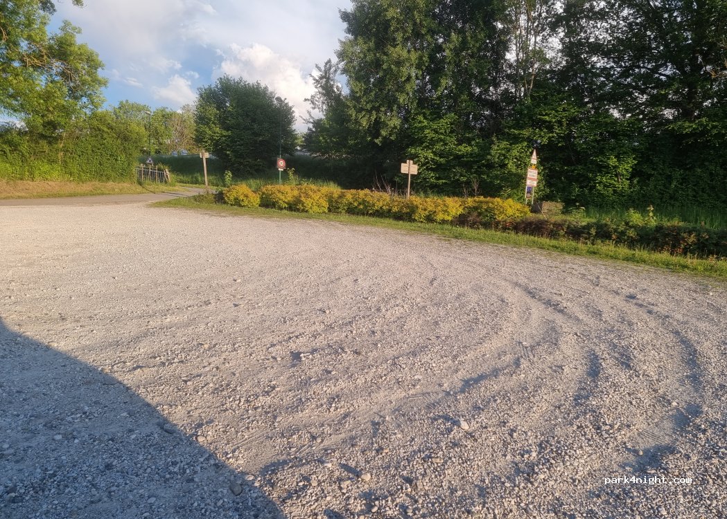 Grand parking en gravier, au calme pour y passer la nuit... Quelques tables de picnic