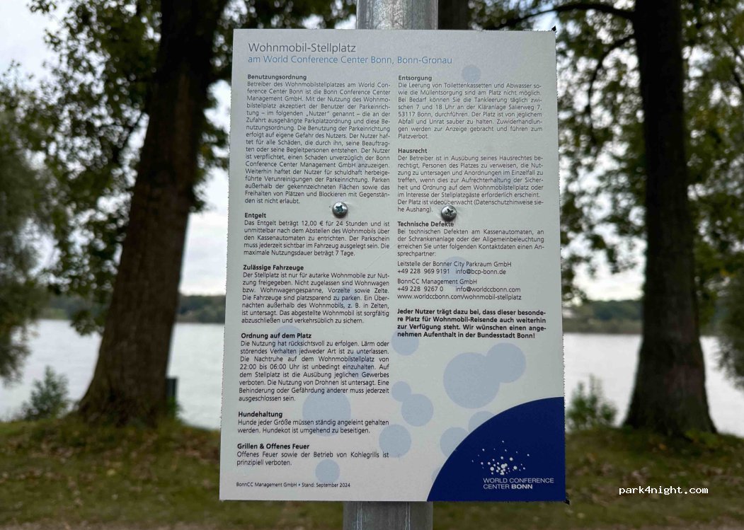 È possibile acquistare il biglietto senza contanti alla biglietteria automatica subito all'arrivo (12 € ogni 24 ore). Non c'è limite di altezza e la strada di accesso è stata allargata. Non è possibile prenotare, ma i posti auto disponibili sono quasi sempre sufficienti. Si tratta di semplici parcheggi senza allacciamenti elettrici, acqua potabile o impianti di smaltimento rifiuti. Le acque grigie e nere possono essere smaltite gratuitamente presso l'impianto di depurazione di Salierweg, a nord di Bonn, durante gli orari di apertura.