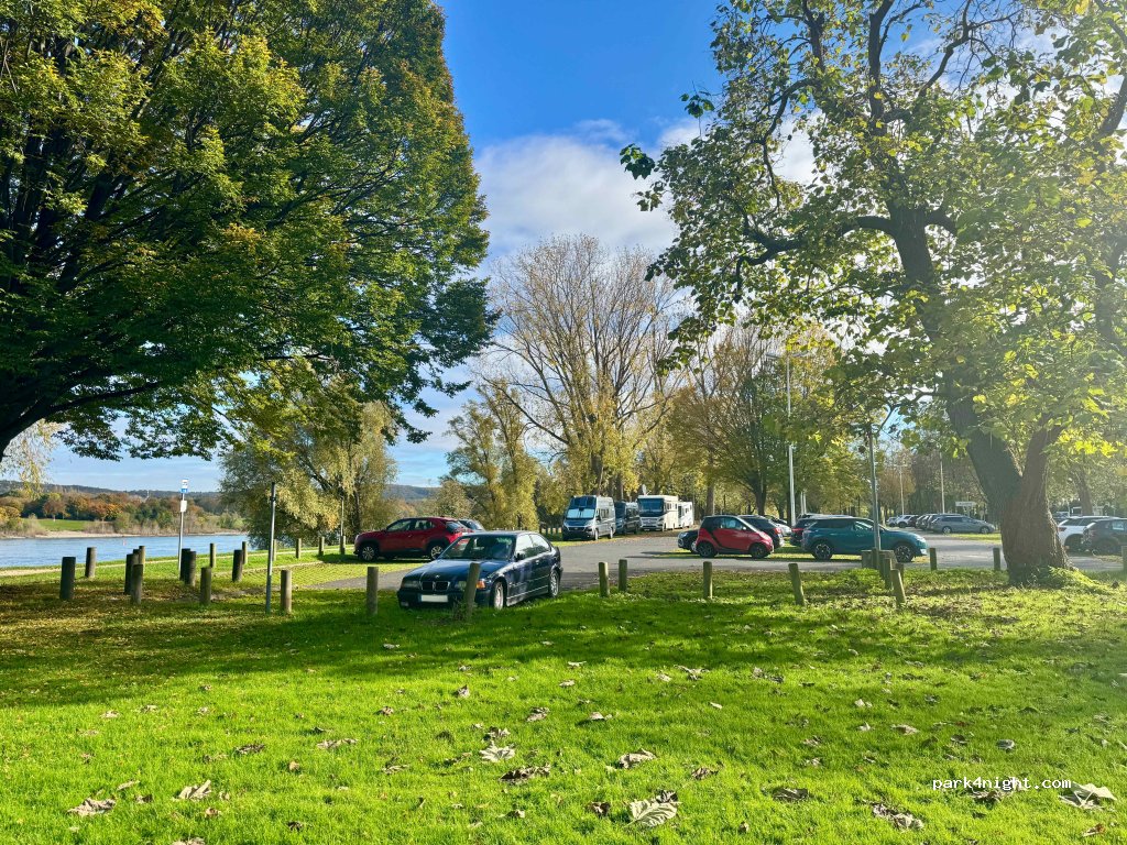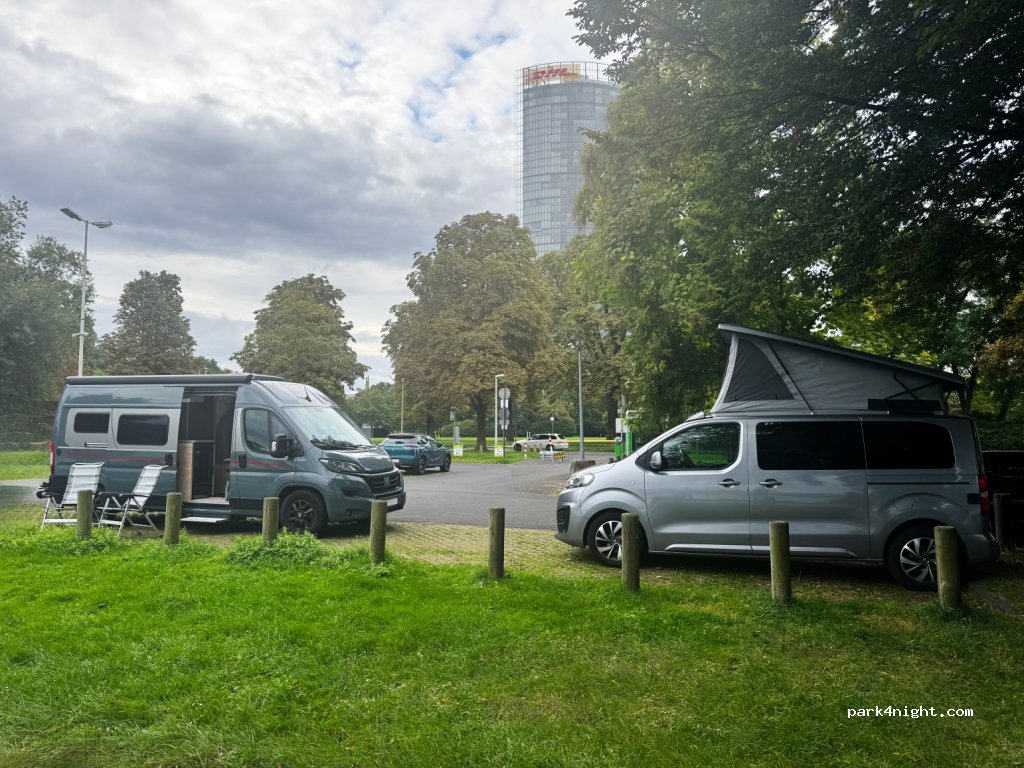 Posto proprio sotto il palazzo del'ONU, questo parcheggio anche notturno lungo le rive del Reno alle porte di Bonn è uno spettacolo. Posti ampi, anche lato fiume; tramonti irresistibili e pace assoluta durante la notte. Costo agosto 2025 12 euro per 24 ore. Se si sosta per un tempo inferiore il prezzo è proporzionato.