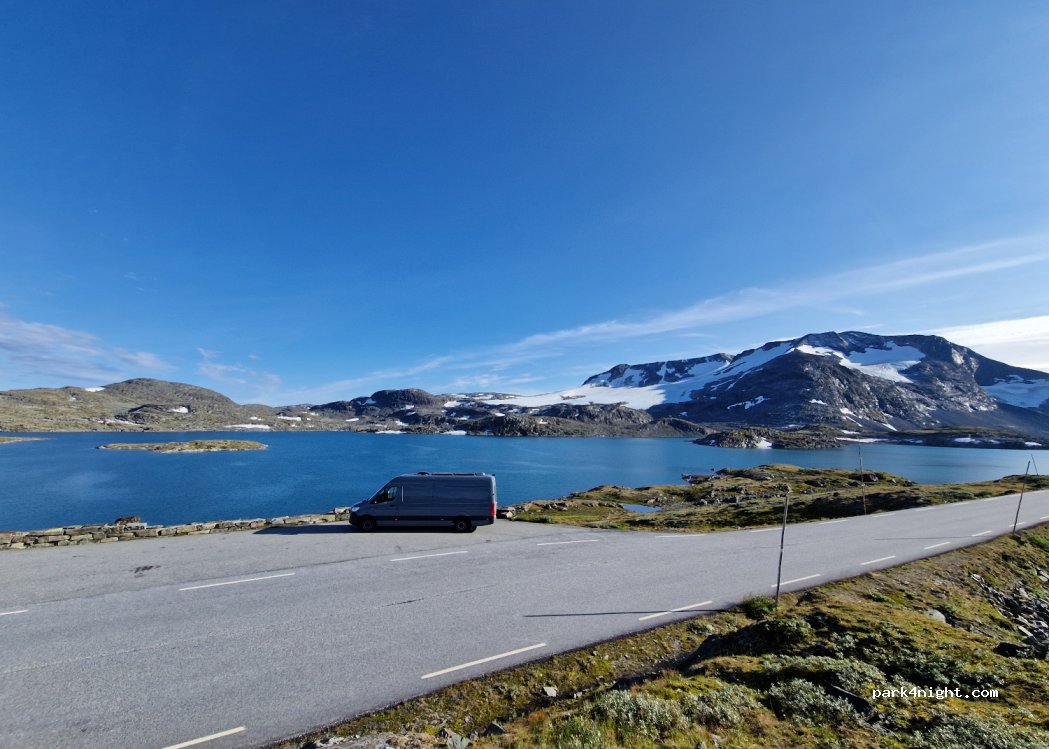 Wir standen auf einem der Plätze unten, Zufahrt am Parkplatz vorbei, Richtung Lom, dort aber sehr eng, besser am nächsten Parkplatz drehen. unten sind mind. 3 Plätze, die Straße hört man kaum, Blick auf See und Gletscher.