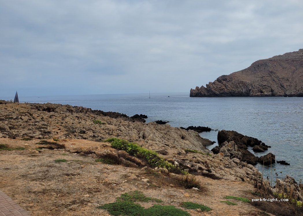 la vue est fabuleuse, le spot est situé au début du Cami de Cavalls et on peut rejoindre la ville à pied en 10 minutes. On peut aussi se baigner dans une petite crique avec un accès à l'eau par une échelle. Mais nous ne somme pas resté la nuit car 2 campers et 2 CC sont arrivés et se sont mis en travers de toutes les places restantes... un manque de respect complet.