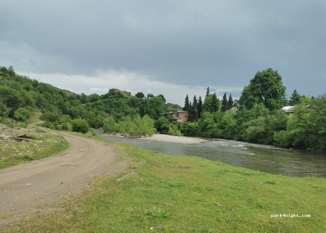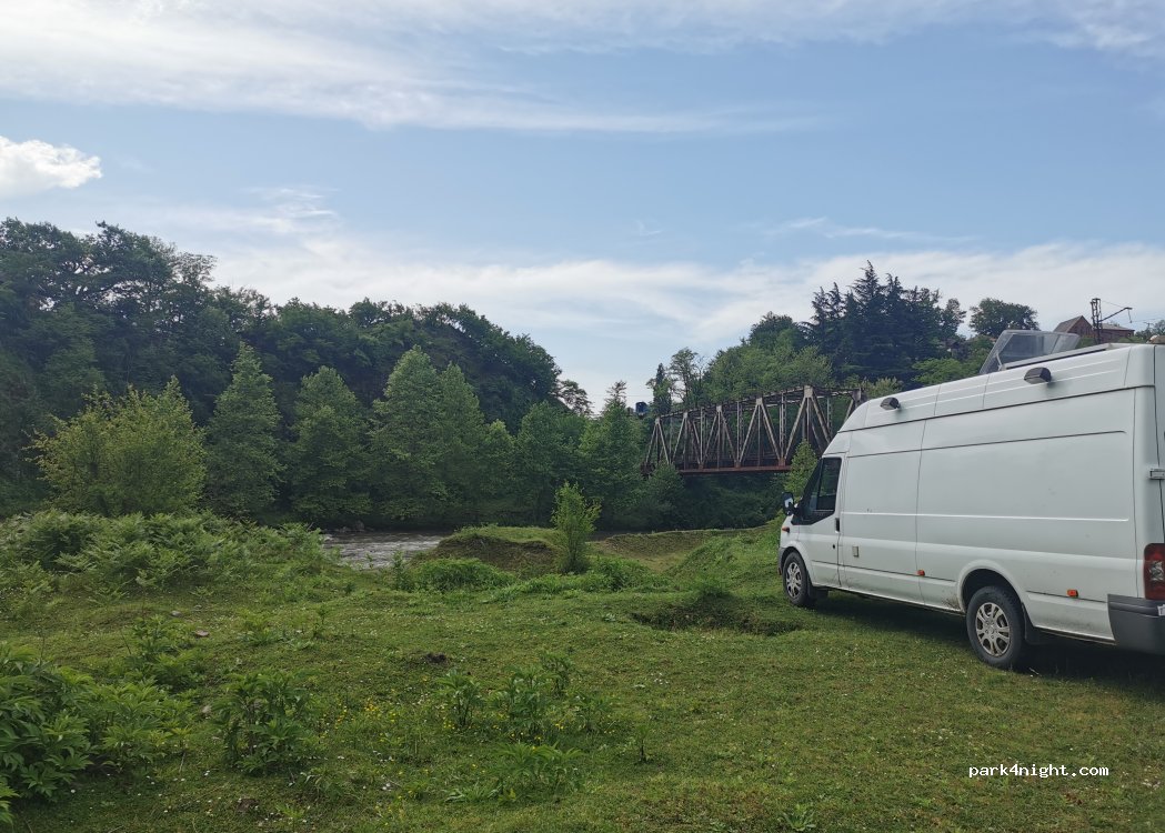 Ein schöner Stellplatz oberhalb eines Flusses. Wir sind mit unserem 6.40m Fahrzeug gut hingekommen. In der Nähe von dem Punkt gibt es eine neue Autobahnausfahrt, von dort aus sind es nur noch 5 Minuten. Google Maps kennt die Ausfahrt nicht. Wir waren hier allein. Lediglich ein Fischer und ein paar Autos kamen vorbei. Viele Kühe und ein schwarzer Schäferhund waren da, der ist aber ängstlich.