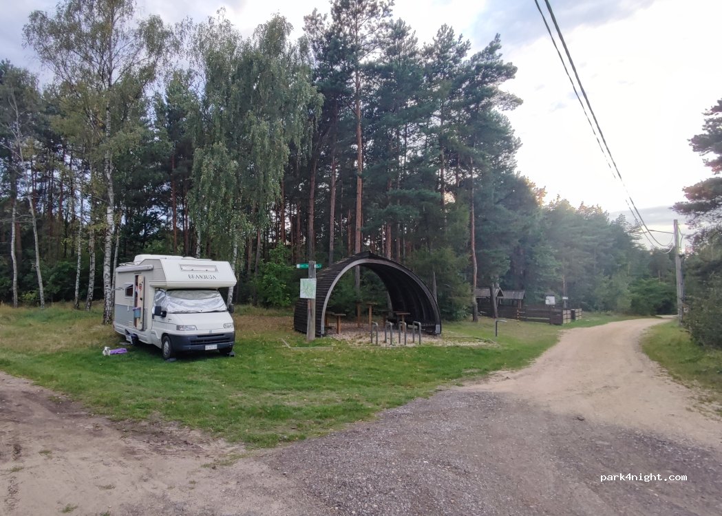 Great place for overnight stay. One can park alongside the gravel road. It is not in the village, it is just at the edge of the forest. Free access to the water tap. Lots of walking or cycling paths. Walking distance to the Centuria hotel - nice for dinner in the restaurant. In the spot it is possible to set a fire. Quiet and safe.