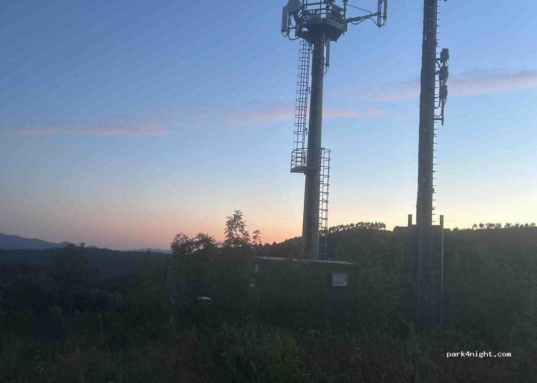 Small gravel place beside a radio station. The path goes away from the main road on the right, and is quickly becoming a gravel road. Nice quiet view on a hill over the valley. Very quiet.