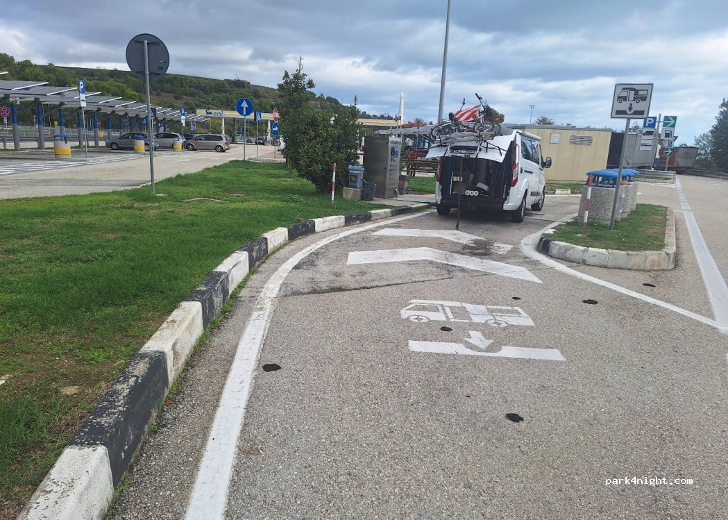 Il posto secondo me non si presta a fare passare una notte con un camper, posto molto piccolo, ci siamo accorti che subito dopo l’area sosta rientrando in autostrada c’è un bel parcheggio isolato circa a 200/300 metri, voto 3 stelle solo perché ha la doccia e i servizi.