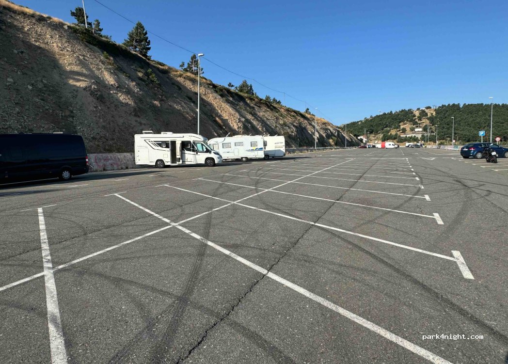 bastante llano sin servicios y plazas amplias que permiten aparcar bien la autocaravana. muy bien ubicado. el inconveniente el ruido de los cañones de nieve y del tráfico.