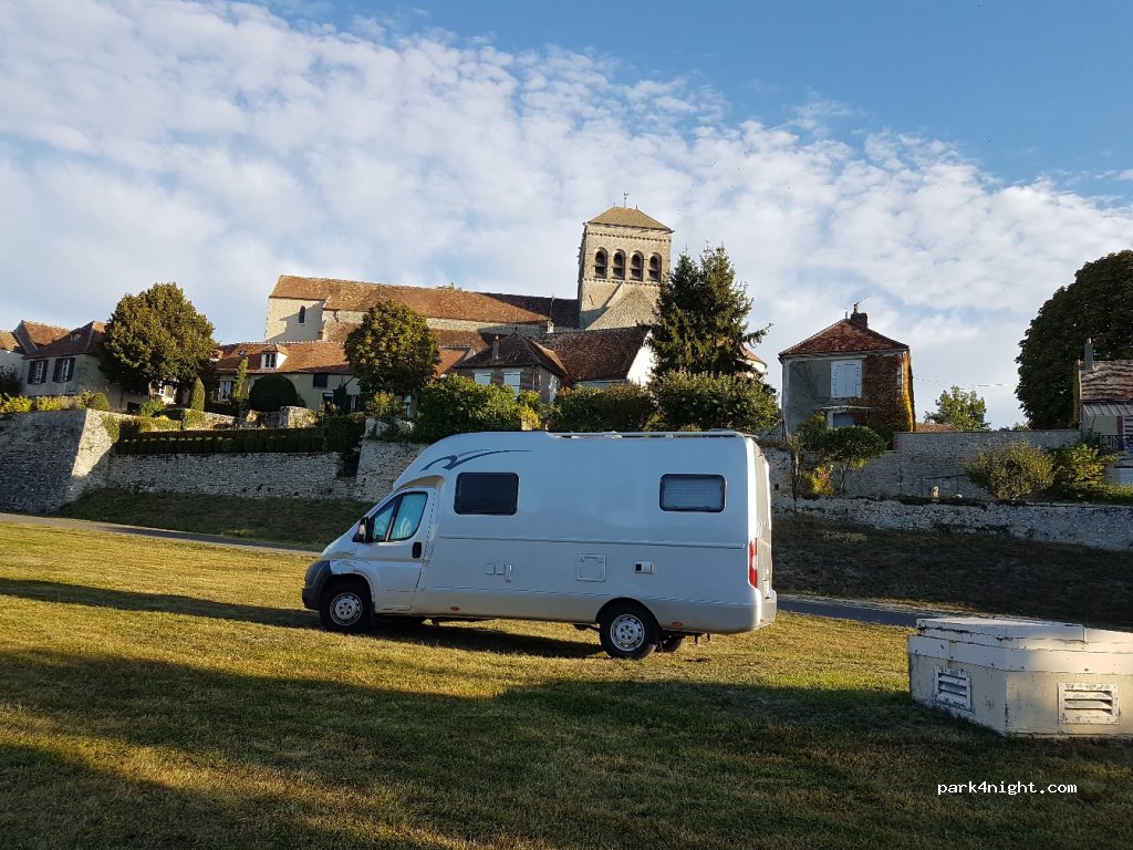 In the village of Saint-Loup-de-Naud, grassy parking along the D 49 below the church of the 12th century, with a beautiful carved portal. Road not very busy but we can hear the cars early in the morning. No shadow.