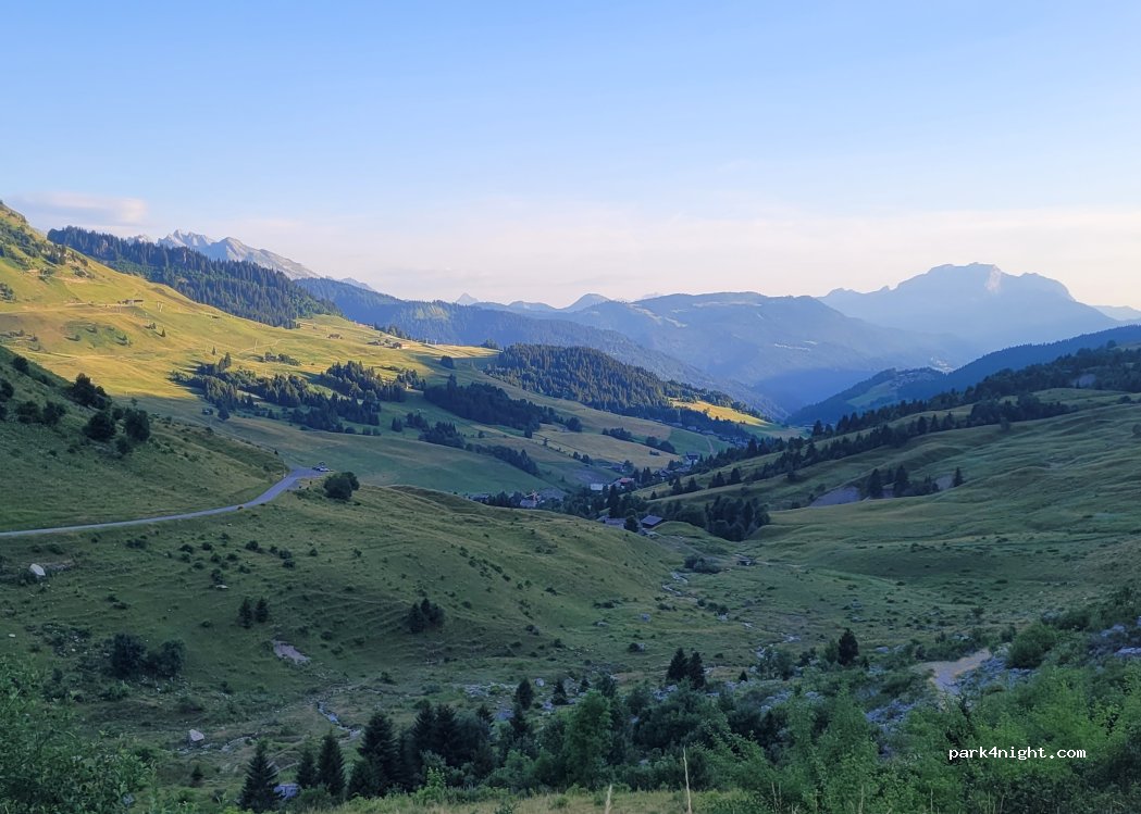 Super vue sur la vallée du grand bornand . Parking en retrait de la route ,plat . Aucun service .