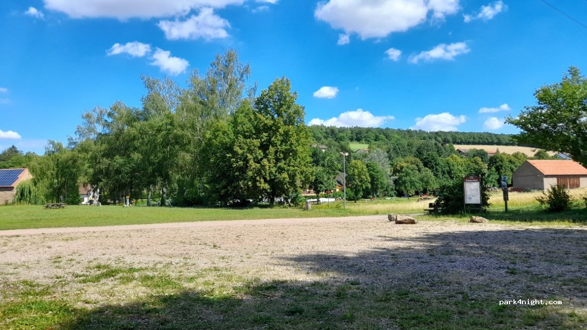 Parc de camping-car Sulzbachtal à Schiersfeld - place de parking gratuite pour 7 Mobile à la périphérie de Schiersfeld. La place de parking est en forêt ou en lisière de forêt et sur une aire aménagée et désignée pour les camping-cars. Endroit principalement plat, en partie ombragé. Terrain avec pelouse gravillonnée. Centre à distance de marche. Sur place : eau douce, électricité. De plus, évacuation des eaux grises à environ 50m. Plus une salle de sport en plein air. A proximité : vieille ville historique et château à 4 km à Obermoschel. Pas de service cellulaire, ou très faible.