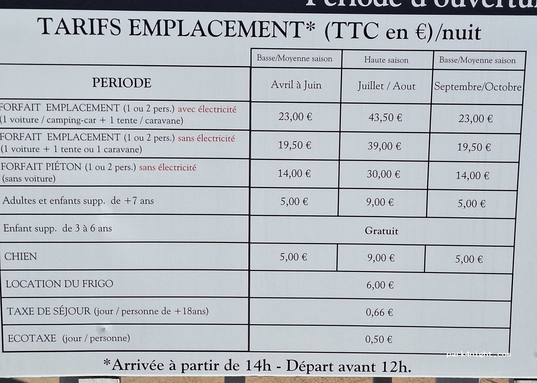 1 nuit en fourgon avec un chien 30 euros. Situé en bord de route, la seule vue sur mer se trouve à la piscine. Emplacements plats, nous n avons pas calé. Dommage le recyclage des eaux usée dégage une odeur désagréable.