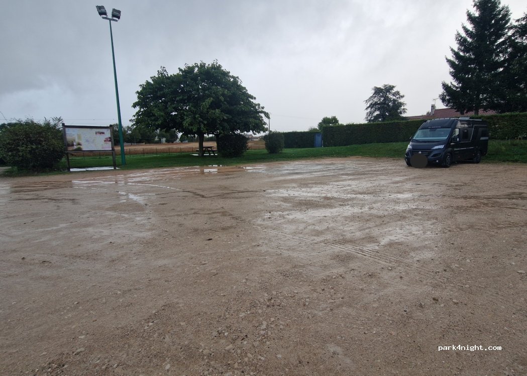 Large fairly flat parking, picnic tables, toilet very clean and without tags. Point of water with push button, place of departure for many pedestrian and mountain bike rides. The road is a little busy during the day but calm at night. Otherwise 200m tarred parking cemetery, flat, quiet but without services