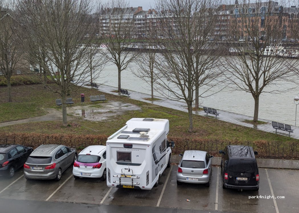 Parking en Zone verte (gratuite). Convient aux petits fourgons (5,40 m). Accès rapide vers le Namur historique et la Citadelle en longeant la Meuse. Très pratique. PS : Je n’y passerais pas la nuit car en bordure de rue et parmi les stationnements de voiture.