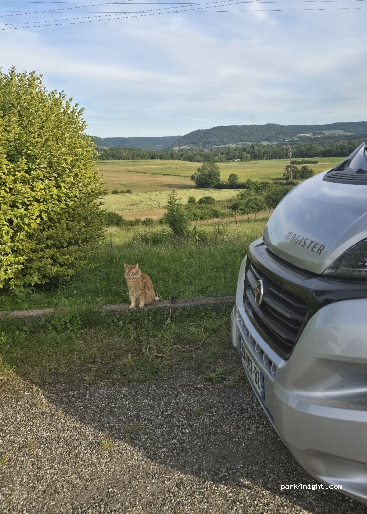 Que du bonheur, un havre de paix, une vue splendide sur les côtes jurassienne. Un terrain un peu en pente mais rien de grave. S'il vous plaît soyez logique et pas comme nos voisins, mettez votre museau de véhicule face aux paysage et non face à la salle des fêtes qui est vraiment moche en plus pour profiter d'un beau lever de jour sur le Jura. S'il faut une petite critique une poubelle serait la bienvenue, mais rien de gênant. Il y a les poubelles pour les verres.