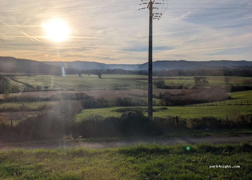 une magnifique vue sur la campagne. Grand parking de la salle polyvalente en légère pente. Une nuit particulière ment calme. Un grand merci à la commune. Je recommande vivement.