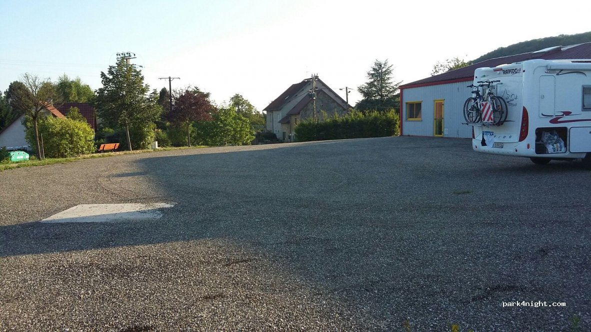 Grote grindplaats bij een feestzaal. Mooi uitzicht en stukje gras met 2 bankjes. Glas bak aan de straat en vuilcontainers bij de ingang( speciaal voor de campers). Geen voorzieningen. Dus kom niet als je niet zelfvoorzienend bent!! Klein dorpje met wat oude waterplaatsen.