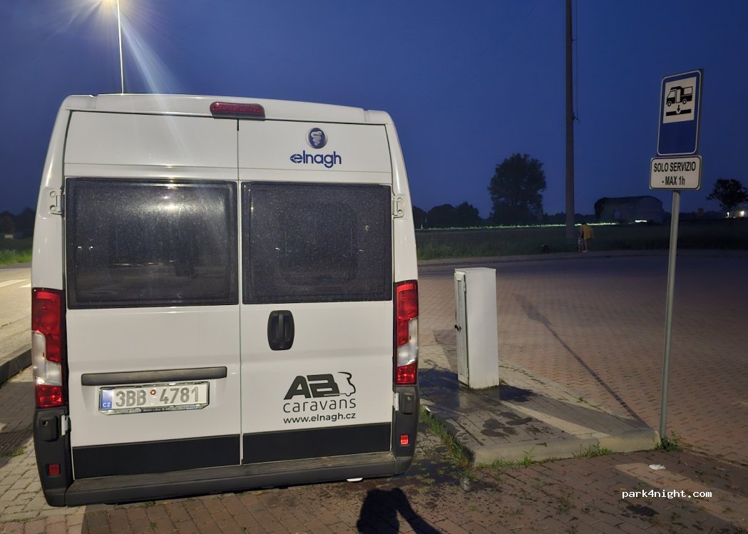 Ottimo per sosta di una notte. Scarico acque grigie e ricarica acqua funzionante. Abbastanza silenziosa sino le 6/7 del mattino dopo c’è movimento di qualche auto che si reca al lavoro. Molto utile se di passaggio.