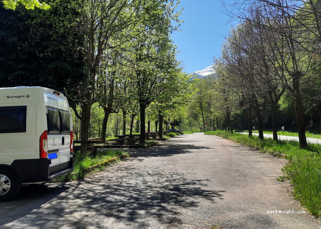 Picknickplatz unter den Kiefern und mit dem Fluss vor. Draußen stehen steinerne Picknicktische und ein Brunnen, aus dem frisches und sauberes Bergwasser fließt und die Tanks nach und nach gefüllt werden können. KEIN AUSPUFF. Ruhig wenig frequentiert (Mitte Februar Nachmittag). Ca. 5 km von der Certosa di Pesio entfernt, die einen Besuch wert ist.