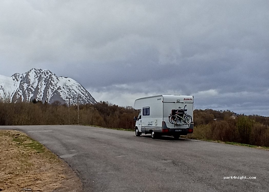 Large parking almost flat everywhere right in front of the water and next to the E10 on the way to the Lofoten Islands. We were there in February, no one else camped there. Some trafic in the evening and morning and some wind. But good for a night ! Beautiful sky!