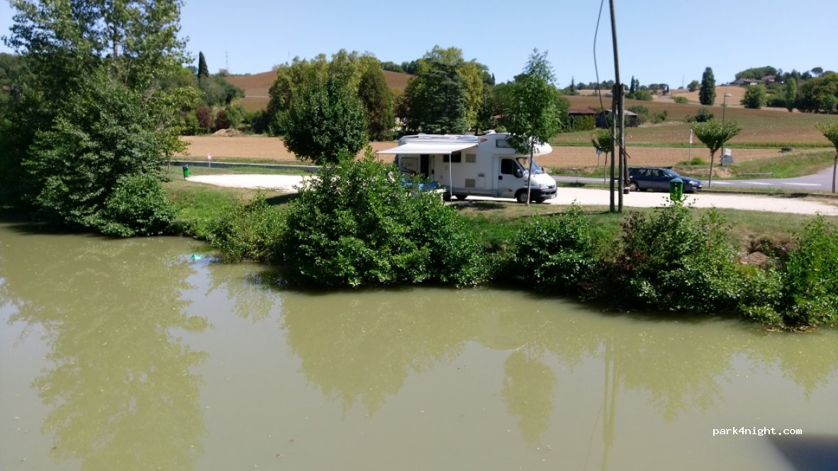 Parfait pour une halte déjeuner ou promenad, tables avec bancs dans la zone ombragée. La zone de stationnement elle n’est pas ombragée, sans doute un peu passager pour la nuit. A côté d'un pont de pierre du XIIIe; ouvrage remarquable sur le Gers.