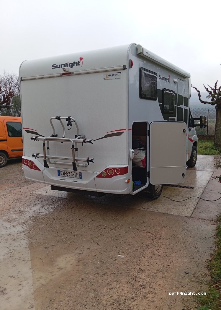 Lugar muy tranquilo y silencioso. Ideal para pasar 1 o 2 noches. Está justo al lado del restaurante Le Mas de Mélyna, muy bueno por cierto (cenamos allí). Hay contenedores de basura y un poquito más arriba de las plazas de aparcamiento tienes para llenar agua y vaciar aguas (grises y negras). En la entrada hay un cartel que te anuncia que tienes que avisar via SMS a la policia de tu llegada.