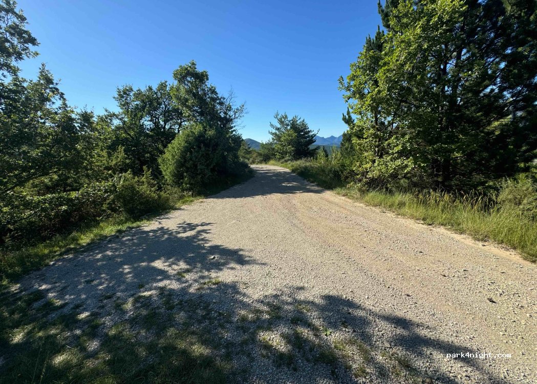 Up the small gravel road running east, 100 m from the top of the pass, quiet spot at the side of the road, out of view from passing traffic. Nice views.