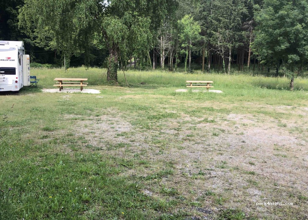 Parking du saut de Chalard. Vue sur le champ et la forêt. Légèrement pentu. Au calme.