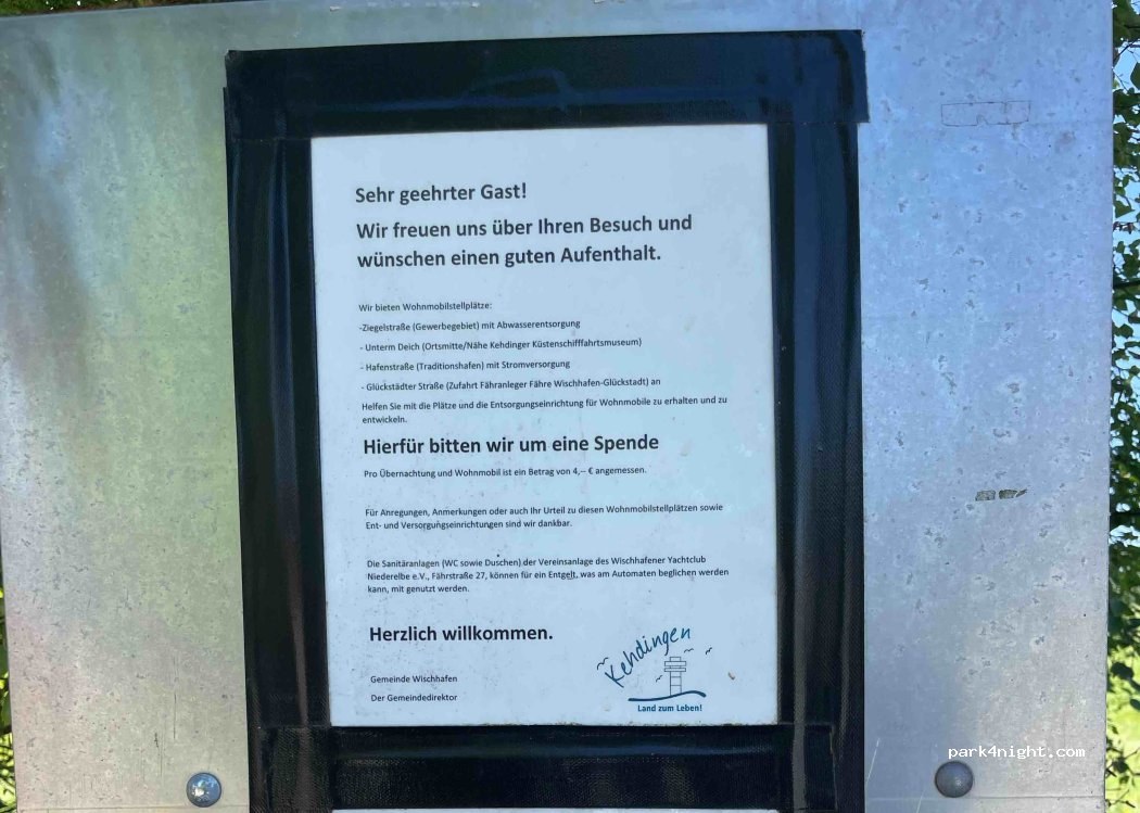 Das Parken von Wohnmobilen ist kostenlos. Direkt an der Elbfähre. Eine Spende ist jedoch erwünscht. Keine sanitären Einrichtungen.